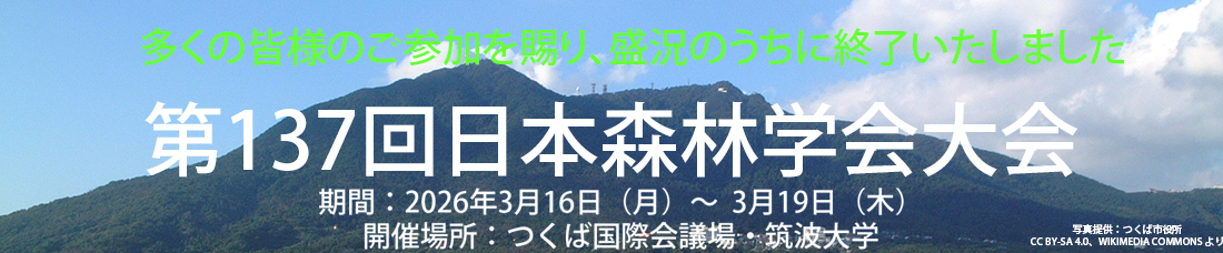 学生ポスター賞の受賞者決定 大会オンラインプラットフォーム・Clarisがオープン ランチョンミーティング「困りごとを共有しようPart2~選択的夫婦別姓制度に関する学協会連絡会アンケート結果~」(会場が変更になっています:3月6日) 2026年度学会各賞授賞業績が決定 暫定版大会プログラムを公開しました。 代議員選挙について(告示) 公募セッション・企画シンポジウムの決定について 第137回大会の詳細が公開されました 2025年度「林業遺産」公募について(募集期間: 2025.9.1〜10.31) 日林誌107巻7号発行のお知らせ 森林科学106号が刊行されました 「岩手県大船渡市の大規模林野火災から一年 -見えてきた課題と今後の展望-」(R8/3/26) 日本森林学会誌108巻2号発行のお知らせ 日林誌108巻1号発行のお知らせ 大会期間中の託児室について 代議員選出理事候補および監事候補の互選投票について(告示) 2026年度からの代議員の選出について(公告) 辰巳晋一会員が日本農学進歩賞を受賞いたしました 日林誌107巻10号、11-12号発行のお知らせ JFR特集「Retention Forestry in Practice」の原稿を募集 もっと見る » 会長挨拶 日本森林学会の概要 定款・規則・内規等 役員・代議員・委員会名簿 公告 賛助会員・広告主募集 連携学会 日本木材学会との交流 ダイバーシティ推進への取り組み 林業遺産 中等教育連携 表彰 ウェブ・フォーラム Journal of Forest Research 日本森林学会誌 森林科学 開催予定や、過去の日本森林学会大会の詳細を閲覧することが出来ます。 日本森林学会大会について > 大会参加に関するお問合せ > 森林・林業に関心をお持ちの方の入会を心から歓迎いたします。 会員の方々のまわりでまだ会員になっていない方には、ぜひ入会をおすすめください。 ご入会はこちらより > 公募・集会等情報の掲載依頼 > 学会事務局問い合わせ > 各種様式のダウンロード > 公益信託四方記念地球環境保全研究助成基金募集のお知らせ(R8/5/29締切) 日本機械学会講習会「流体とインフォマティクス」講習会「流体とインフォマティクス」(R8/4/21) 北海道大学大学院地球環境科学研究院環境生物科学部門陸域生態学分野准教授公募(R8/4/6締切) 第23回(令和8年度(2026年度))日本学術振興会賞受賞候補者の推薦について 生研支援センター「オープンイノベ」「スタートアップ」の令和8年度公募開始のご案内(R8/3/23締切) もっと見る» UPDATE HISTORY更新履歴 2026.3.17 日本森林学会大会 学生ポスター賞の受賞者決定 2026.3.13 おしらせ 大会オンラインプラットフォーム・Clarisがオープン 2026.3.6 学会からのお知らせ 森林科学106号が刊行されました 2026.3.4 学会からのお知らせ 「岩手県大船渡市の大規模林野火災から一年 -見えてきた課題と今後の展望-」(R8/3/26) 2026.3.2 一般情報 公益信託四方記念地球環境保全研究助成基金募集のお知らせ(R8/5/29締切) もっと見る »