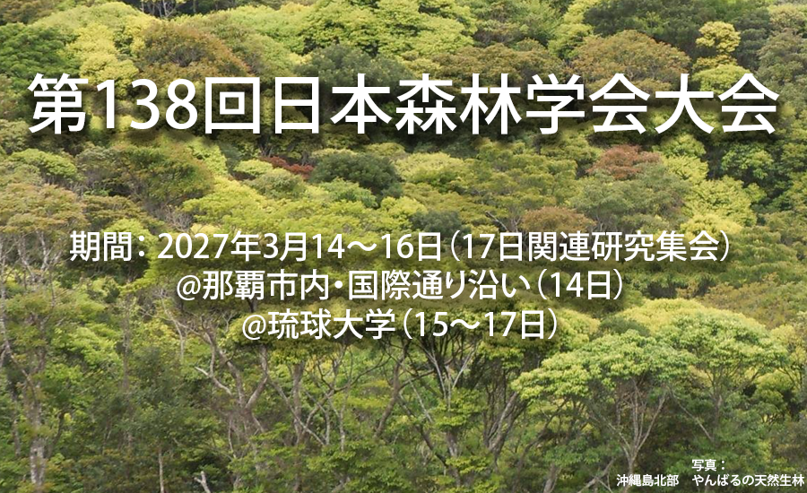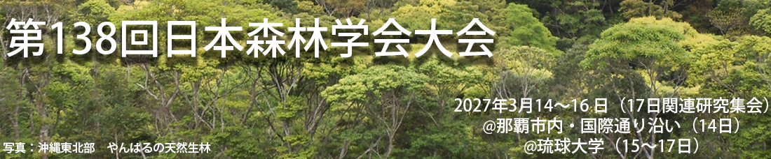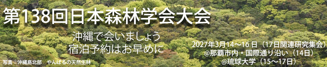 【速報】第138回日本森林学会大会(沖縄大会)の概要が決まりました。 高校生ポスター受賞校決定 学生ポスター賞の受賞者決定 大会オンラインプラットフォーム・Clarisがオープン ランチョンミーティング「困りごとを共有しようPart2~選択的夫婦別姓制度に関する学協会連絡会アンケート結果~」(会場が変更になっています:3月6日) 2026年度学会各賞授賞業績が決定 暫定版大会プログラムを公開しました。 代議員選挙について(告示) 公募セッション・企画シンポジウムの決定について 第137回大会の詳細が公開されました 第137回日本森林学会大会講演要旨集の冊子版が刊行されました 日本森林学会誌108巻3号発行のお知らせ 日本森林学会公開講演会について(2026/5/26 14:00~16:30) 森林科学106号が刊行されました 日本森林学会誌108巻2号発行のお知らせ 日林誌108巻1号発行のお知らせ 大会期間中の託児室について 代議員選出理事候補および監事候補の互選投票について(告示) 2026年度からの代議員の選出について(公告) 辰巳晋一会員が日本農学進歩賞を受賞いたしました もっと見る » 会長挨拶 日本森林学会の概要 定款・規則・内規等 役員・代議員・委員会名簿 公告 賛助会員・広告主募集 連携学会 日本木材学会との交流 ダイバーシティ推進への取り組み 林業遺産 中等教育連携 表彰 ウェブ・フォーラム Journal of Forest Research 日本森林学会誌 森林科学 開催予定や、過去の日本森林学会大会の詳細を閲覧することが出来ます。 日本森林学会大会について > 大会参加に関するお問合せ > 森林・林業に関心をお持ちの方の入会を心から歓迎いたします。 会員の方々のまわりでまだ会員になっていない方には、ぜひ入会をおすすめください。 ご入会はこちらより > 公募・集会等情報の掲載依頼 > 学会事務局問い合わせ > 各種様式のダウンロード > 2026年度「先進ゲノム支援」支援対象課題の公募のお知らせ(R8/5/12締切) 2026年度第1回木質バイオマス利用研究会「持続可能な木質バイオマス利用」のお知らせ(R8/6/14) 東京農工大学 グローバル教育院助教募集のお知らせ(R8/5/8締切) 公益信託エスペック地球環境研究・技術基金2026年度助成対象者の募集について( 第10回国際窒素会議(N2026)のお知らせ(R8/11/2-11/6) もっと見る» UPDATE HISTORY更新履歴 2026.4.7 一般情報 2026年度「先進ゲノム支援」支援対象課題の公募のお知らせ(R8/5/12締切) 2026.4.7 学会からのお知らせ 第137回日本森林学会大会講演要旨集の冊子版が刊行されました 2026.4.6 学会からのお知らせ 日本森林学会誌108巻3号発行のお知らせ 2026.4.3 一般情報 2026年度第1回木質バイオマス利用研究会「持続可能な木質バイオマス利用」のお知らせ(R8/6/14) 2026.4.2 一般情報 東京農工大学 グローバル教育院助教募集のお知らせ(R8/5/8締切) もっと見る »